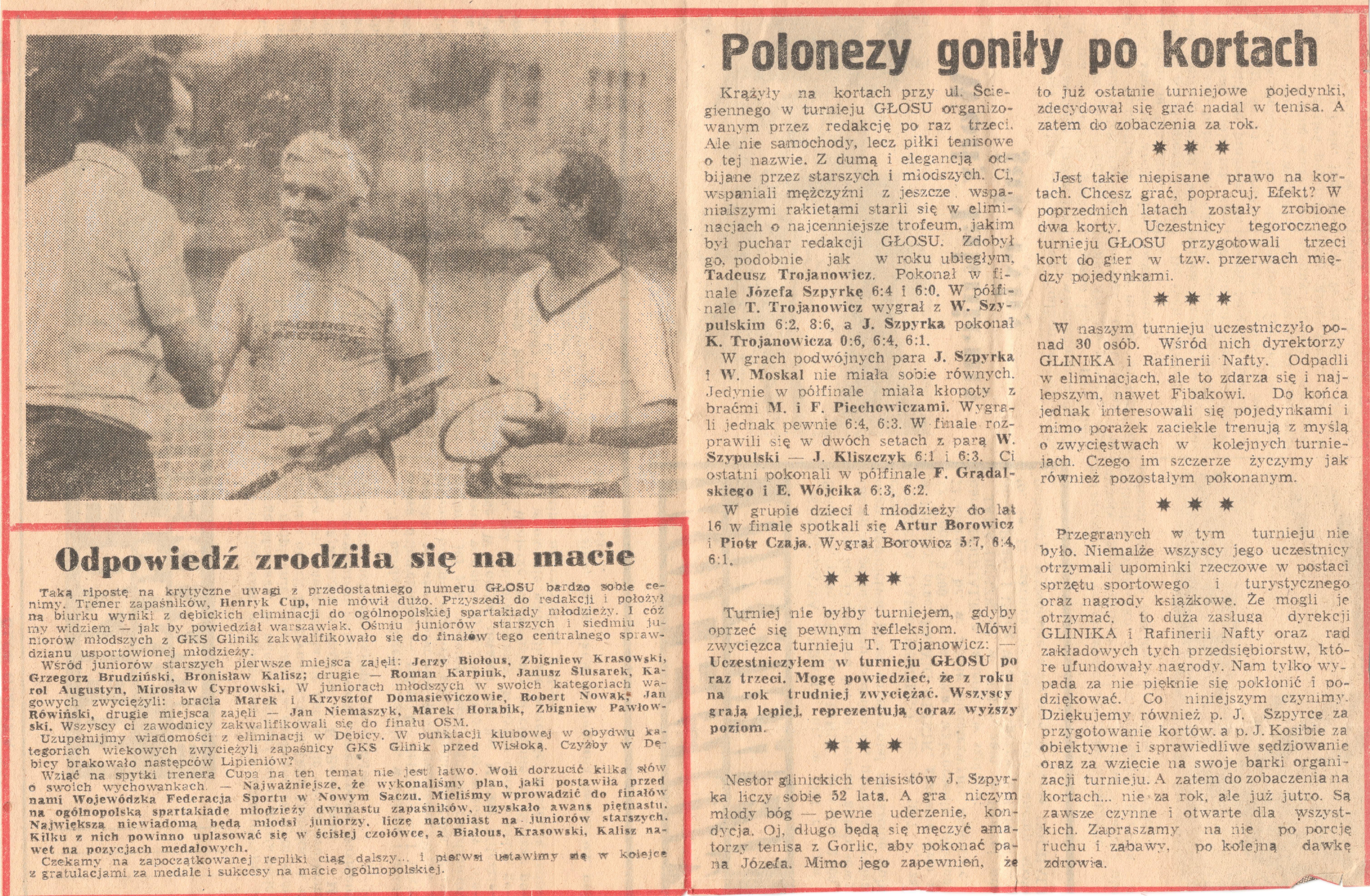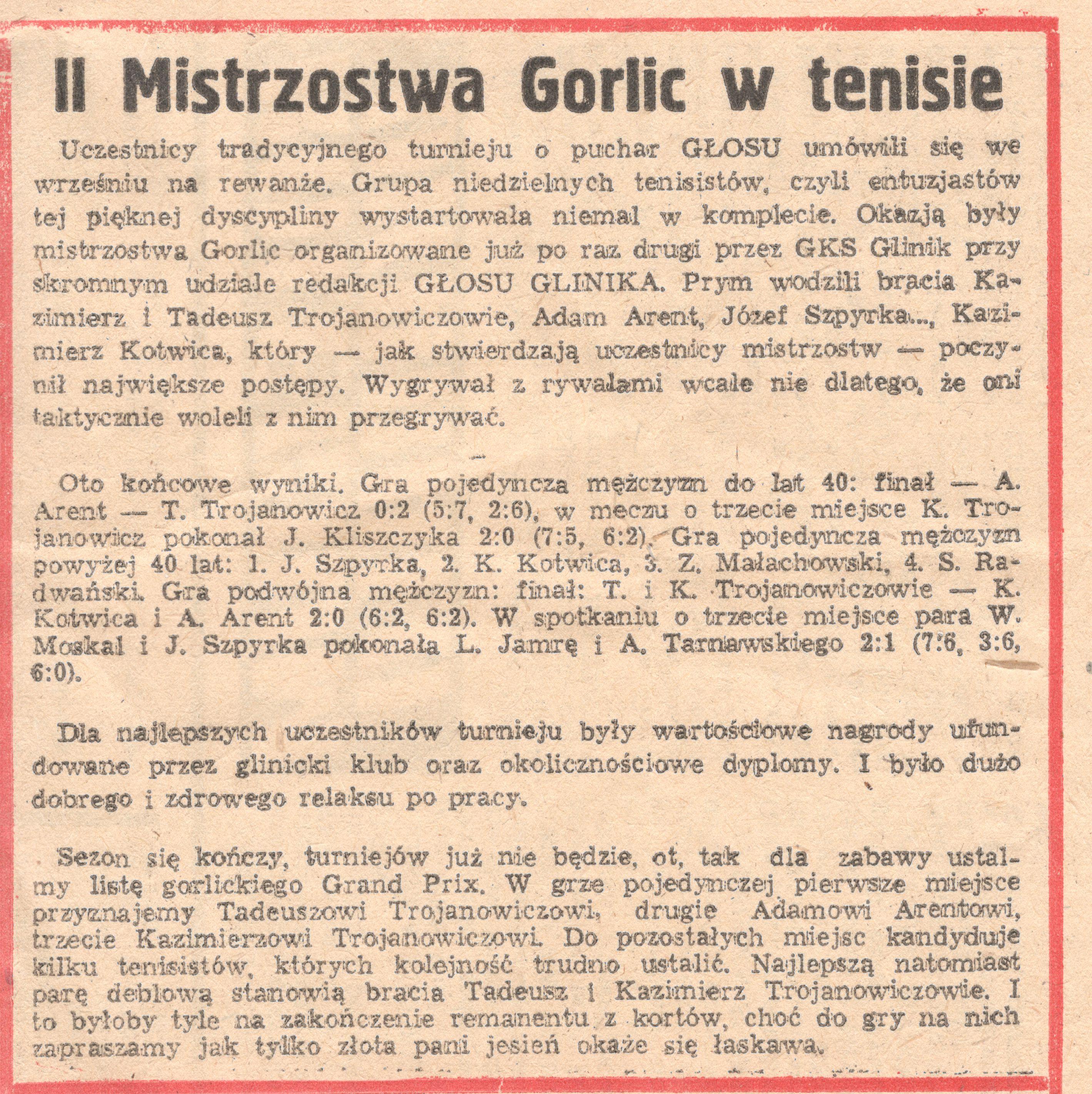 Prestiżowym wydarzeniem sezonu tenisowego tamtych lat, znakomicie wpisującym się propagandowo w rywalizację Świata Pracy był mecz pomiędzy Rafinerią Nafty ,,GLIMAR” i Fabryką Maszyn Wiertniczych i Górniczych ,,GLINIK”. Za sprawom braci Kazimierza i Tadeusza Trojanowiczów w grach pojedynczych triumfowała zawsze FMWiG ,,Glinik” i to 4:0. Natomiast w grze podwójnej zazwyczaj padał remis 2:2, jak to było w 1978 r. Zakaz wydawania ,,Głosu Glinika” w wyniku ogłoszenia stanu wojennego w 1981 r. nie spowodował zaniechania organizacji turniejów tenisowych. Rolę organizatora Otwartych Mistrzostw Gorlic w Tenisie Ziemnym – bo tak się teraz nazywały te zawody – przejął Miejski Ośrodek Sportu i Rekreacji w Gorlicach.